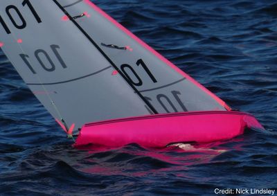 Note, class rules only allow three mainsail leach battens in the DF65 C rig mainsail. There is no batten above the class insignia in this sail.
